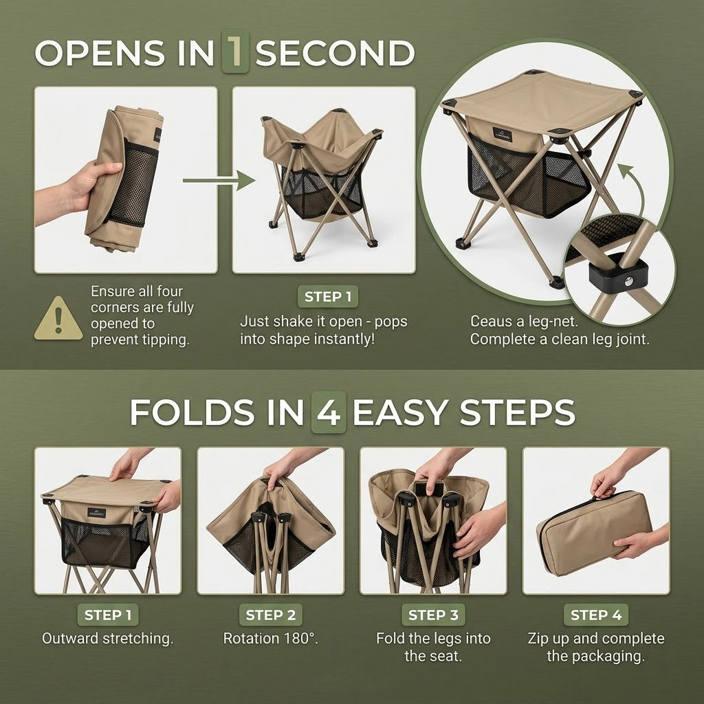 A compact all in one setup designed to give you instant comfort wherever you go. Whether you're camping, at the beach, or taking a quick break outdoors, it gives you a stable place to sit and relax anytime, anywhere without carrying extra gear.